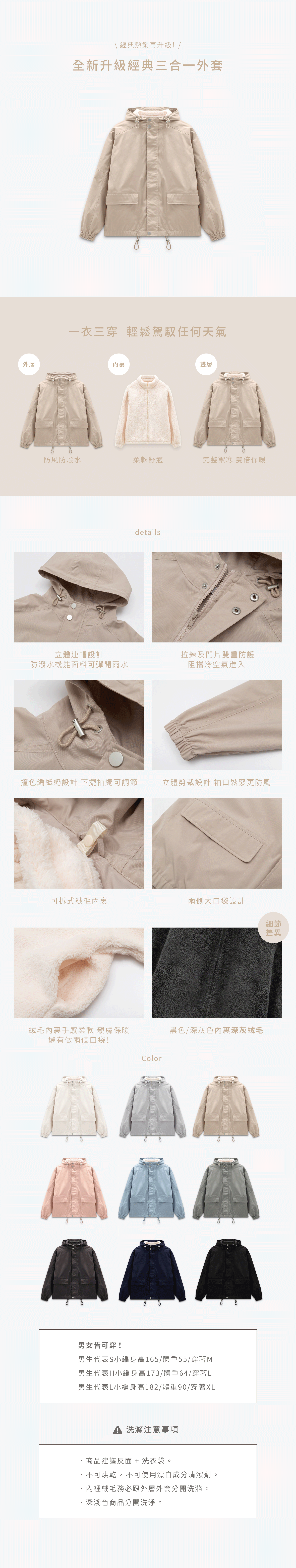 【內裡絨毛需要跟外層外套分開洗滌】(避免深淺色商品互相染色)詳細可於商品下方洗滌注意事項參閱