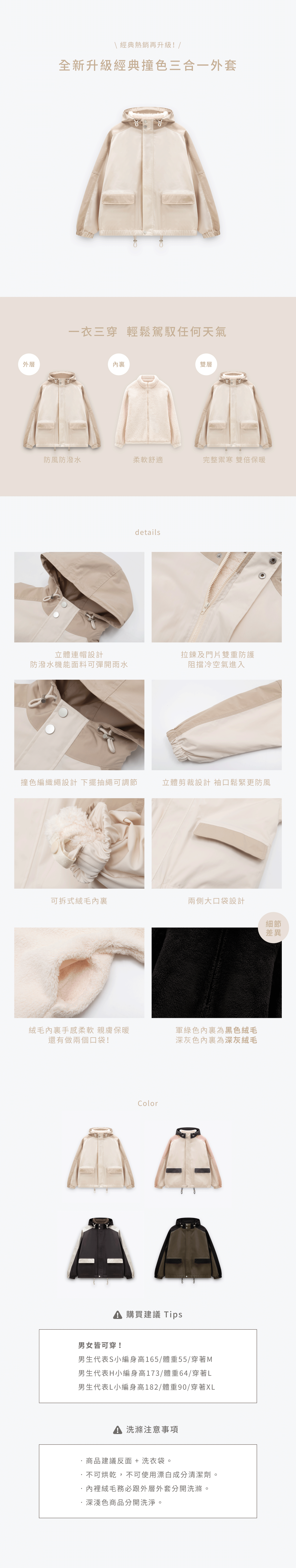 【內裡絨毛需要跟外層外套分開洗滌】(避免深淺色商品互相染色)詳細可於商品下方洗滌注意事項參閱